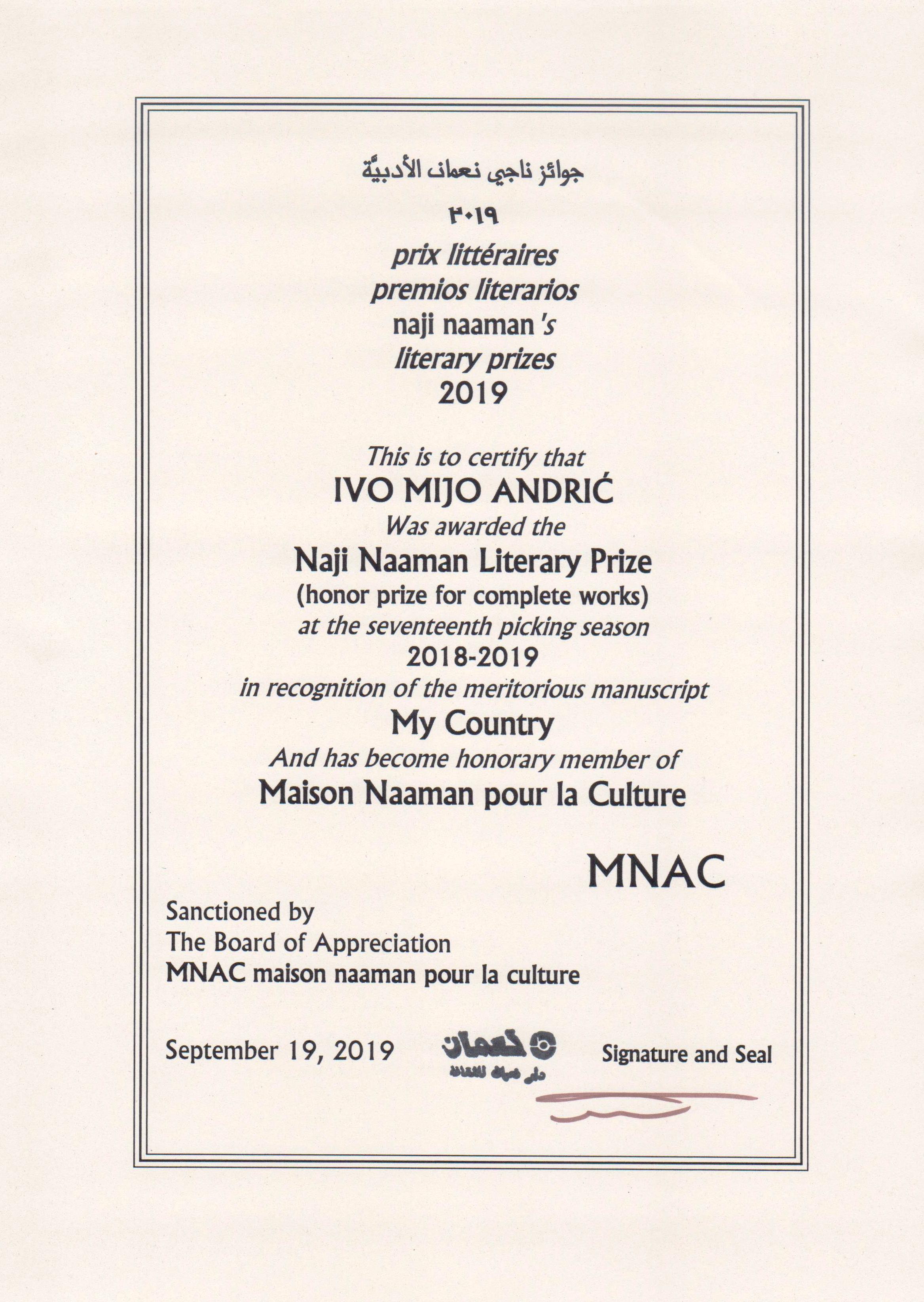 IVO MIJO ANDRIĆ dobitnik je Naji Naaman književne nagrade za 2019. godinu.